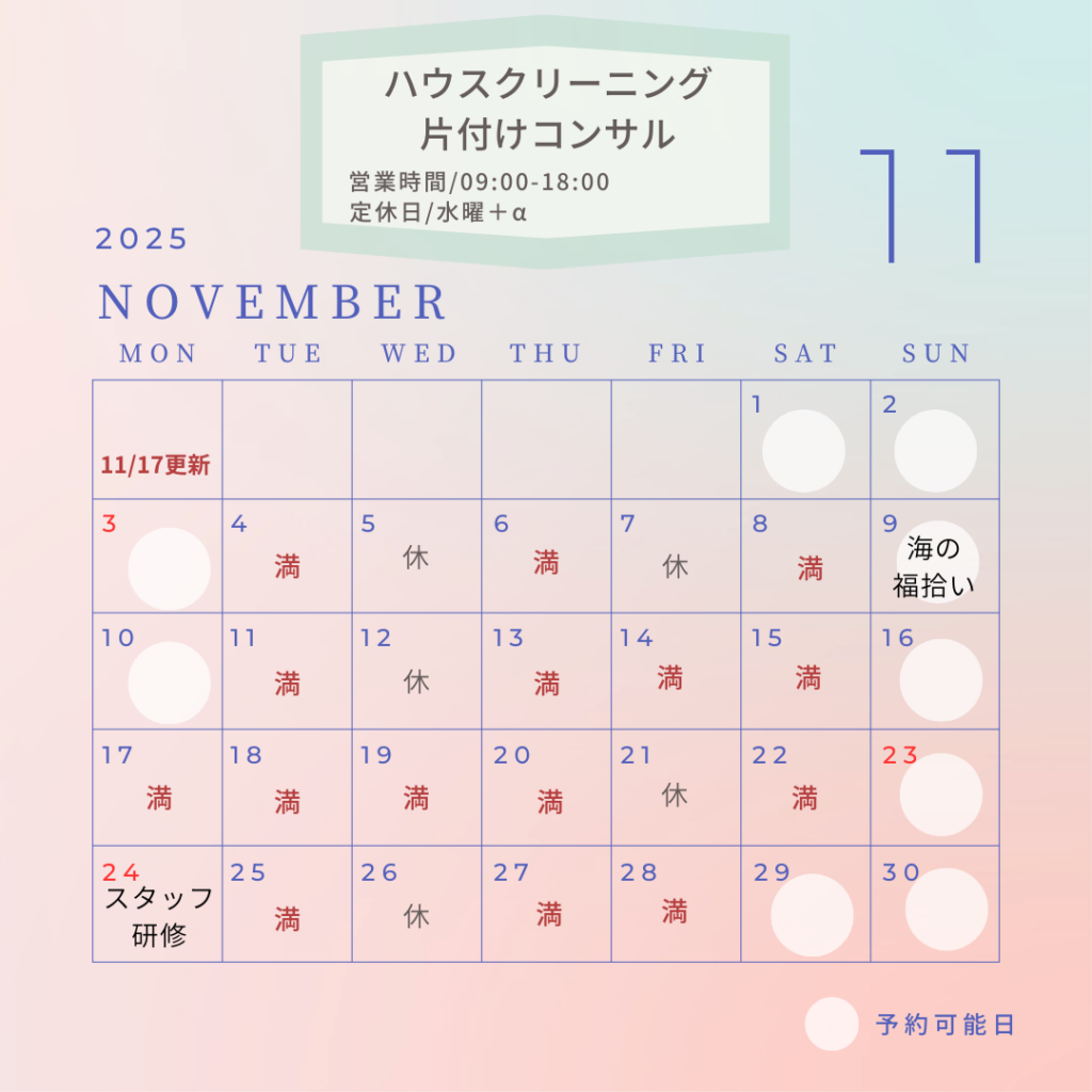 11月ご予約枠残りわずかとなりました(ハウスクリーニング)